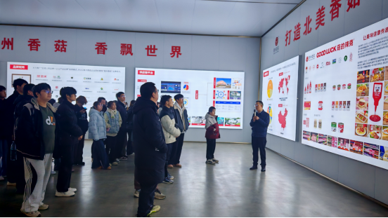 在智能生产车间,同学们重点观摩了香菇酱全流程自动化生产线,近距离见证了从原料处理到成品入库的完整工序:香菇原料经气泡清洗机去除泥沙杂质后,由智能切丁机切成均匀丁状,随后进入行星炒锅完成自动翻炒熬制,搭配精准配料系统实现辅料的定量添加与混合;炒制完成的香菇酱通过管道输送至定量灌装机,完成精准灌装后,依次经过自动旋盖、高温杀菌、贴标打码等自动化环节,最终由机械手完成装箱入库。过程中,同学们还了解到工业机器人、智能传感器、物联网设备在各环节的联动应用,清晰看到设备运行数据实时回传至控制终端;在数据监控中心,技术人员现场演示了生产数据的实时采集、分析与可视化呈现过程,让同学们直观感受到大数据技术在企业生产管理中的重要作用。