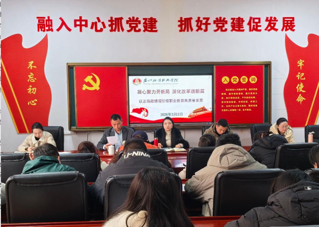 会上,全体教职员工专题学习教育部《关于深化职业教育教学关键要素改革的意见》,聚焦专业、课程、教材、教师、实习实训五大核心要素,同步学习《2026年全省教育工作会议会议精神》、《新时代高校教师职业行为十项准则》等文件精神,把准政策方向、筑牢思想根基。