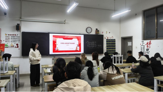 主题班会中,各班辅导员与班委聚焦大学生人身与财产安全的核心风险点,分模块开展讲解。在人身安全板块,重点围绕校园及周边出行安全、夜间活动防护、交友安全、紧急情况自救等内容展开:通过播放交通意外、校园周边安全隐患警示短片,提醒同学们遵守交通规则;结合近期社会上发生的涉大学生安全事件,讲解“识别危险信号、拒绝不合理邀约、遭遇紧急情况及时报警”的实用方法,强调“生命安全高于一切”的理念。