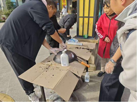 2025年11月20日信息工程学院志愿者免费帮居民清理锅底顽固污垢,全程采用“物理预处理+化学清洁+静置生效”的科学流程。